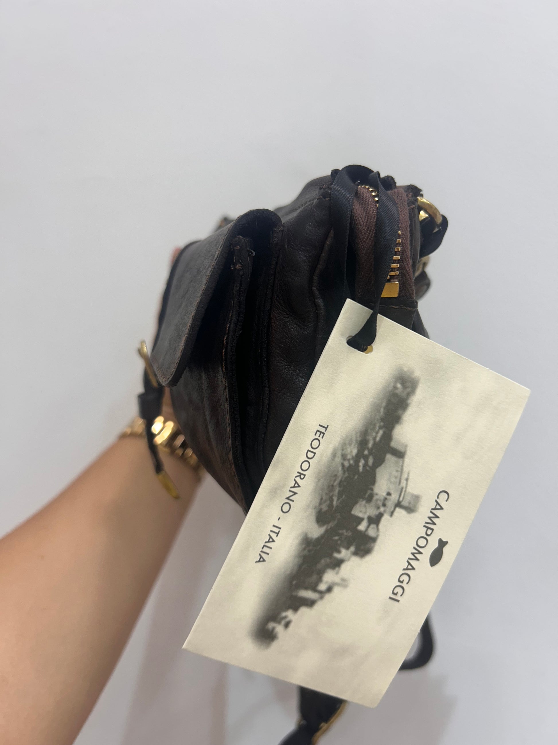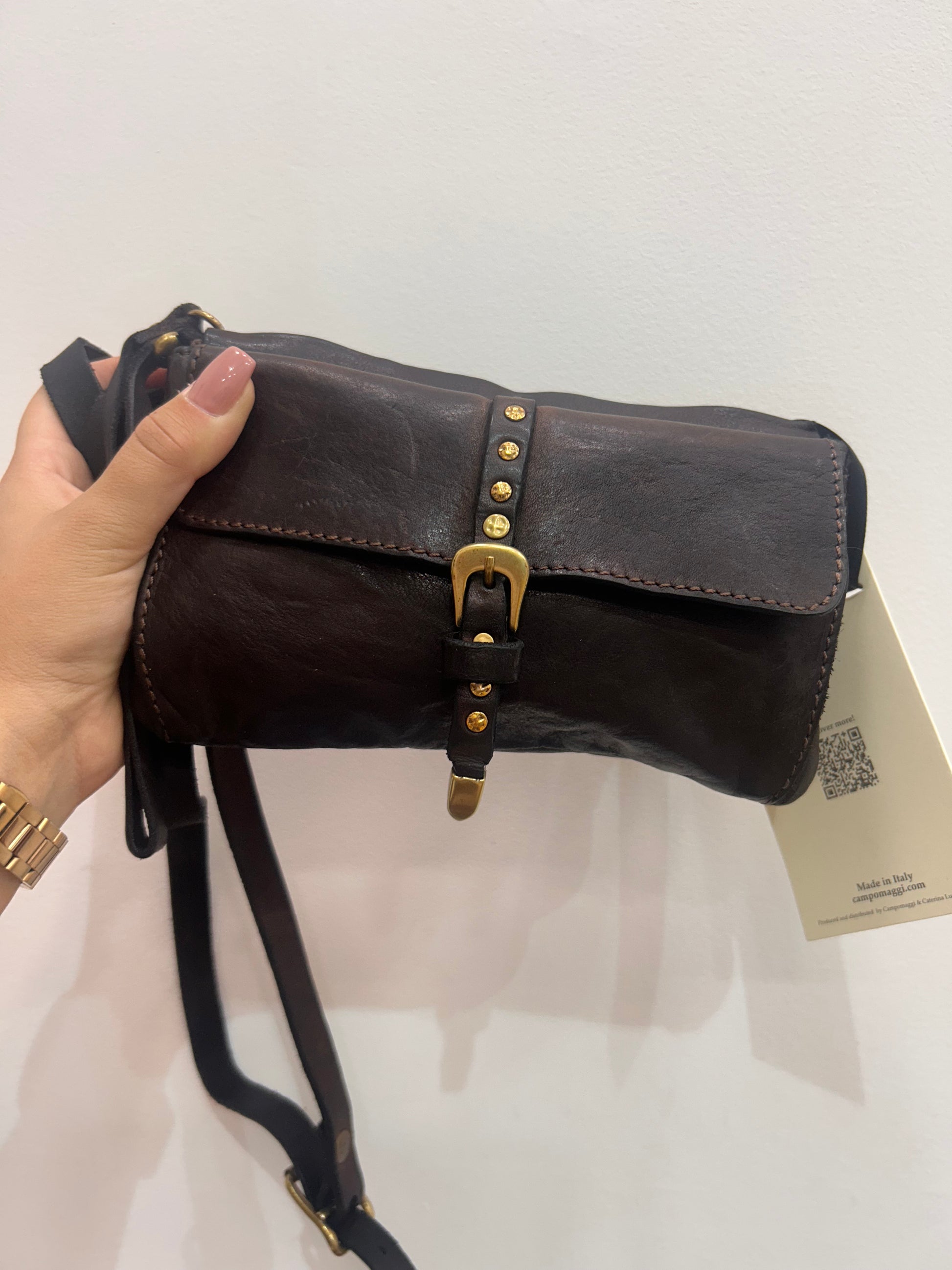 A super cute xbody with a satchel pocket on the front that closes with a stud trim. The main section of the bag closes with a zip and has 2 compartment