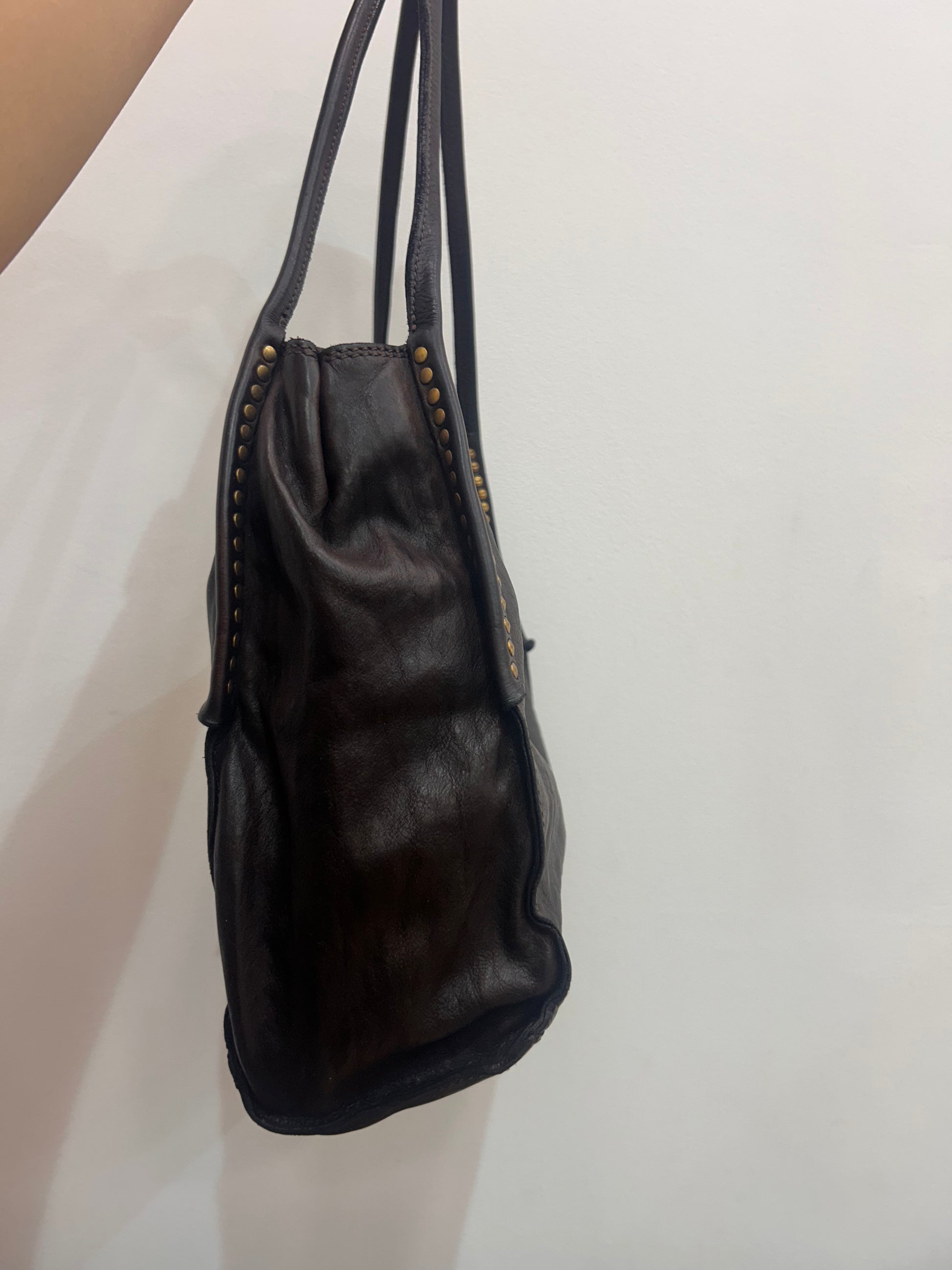 Perfect everyday size bag with slim double handles with mini stud trim half way down the body of the bag from the handles. Also a longer adjustable strap.