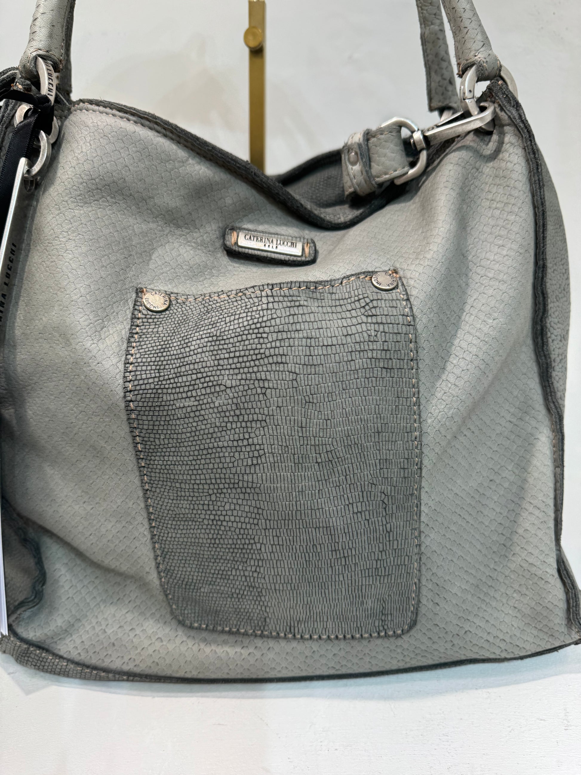 Textures cut into the leather add to softness, double handles and an additional long strap. Zip to close plus internal pockets.