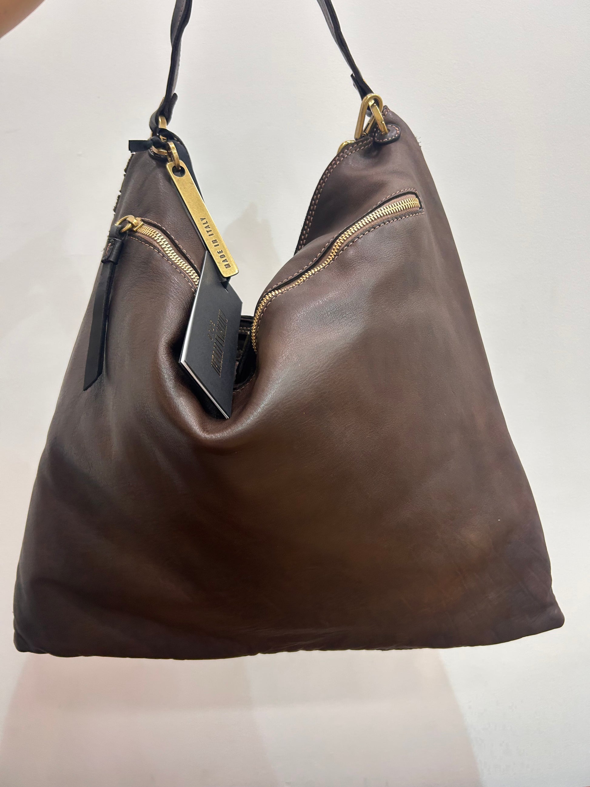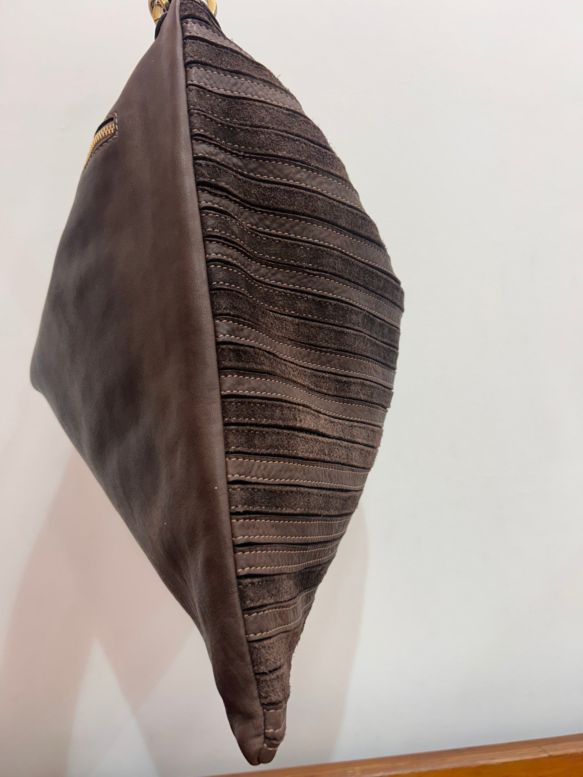 Stripes of leather across the front of this bag in contrast finishes. Short shoulder and longer strap. Zip to close.