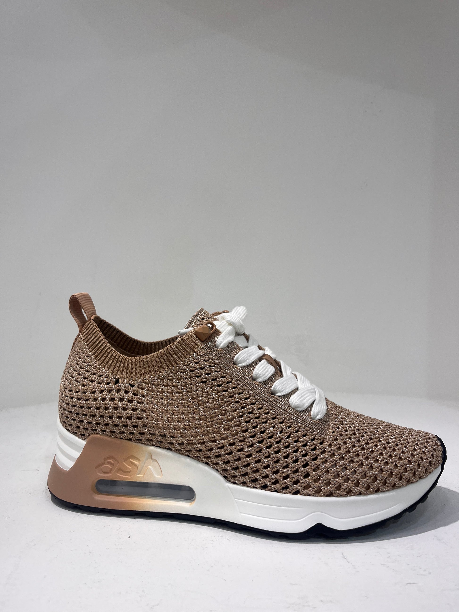 Knitted pull on trainer with a lifted padded insole for amazing comfort. Laces to tighten and a shimmer through the knit for a hint of glamour!