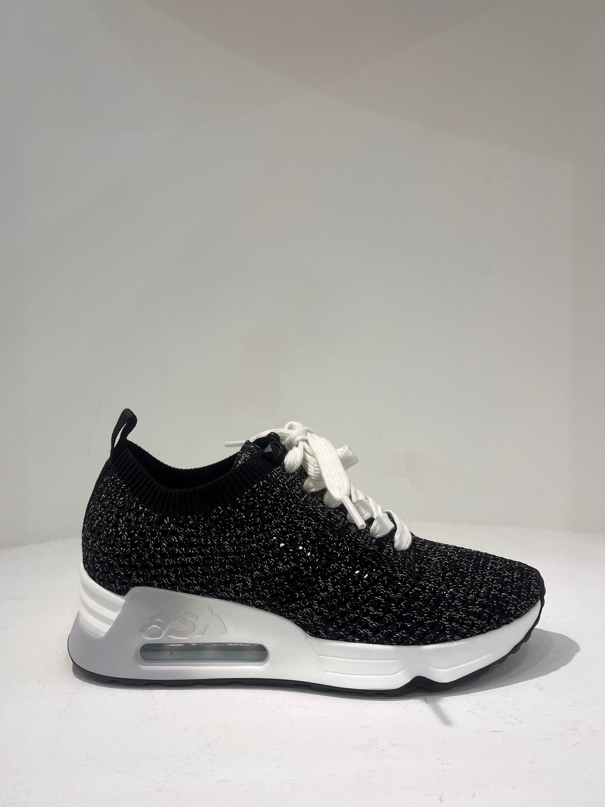 Knitted pull on trainer with a lifted padded insole for amazing comfort. Laces to tighten and a shimmer through the knitr glamour!